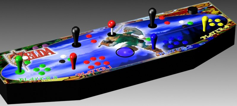 What a thing of beauty! It's got super keen Zelda artwork all over it. ... Wait a god damn minute, Zelda is a CONSOLE game. This is about ARCADE games, you idiot. Go play Zelda on your Nintendo shitstick. Oh, and last I remember, Zelda didn't have SEVEN PLAYERS. Ok, so, maybe this guy just has a fetish for Zelda. Gay, but allright. Given that, what in the fuck is up with all those jollyrods? A dedicated 4 way? Ok. 2 dedicated rotary sticks? Hey, know what? ROTARY STICKS WORK JUST FINE AS REGULAR STICKS IN GAMES THAT DON'T USE ROTATION, genius. I find it impossible to believe that this guy has enough friends to ever need four player. I dunno about you, but I always loved playing spinner games standing off to the right side of the cabinet. Something about the horrid angle of view added that extra bit of challenge. Glad to see someone keeping that alive. NOTE: YES, I KNOW this is a rendering. It's the design that sucks. Built or just concieved, it's still atrocious. |