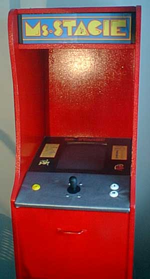Nothin' like red painted particle board to show the wife you really love her. I can appreciate the motive; but there is a reason why you don't put a lump of coal on a ring. Good intentions do not automatically equal good quality. Dude built a MAME box that only plays MS Pac Man for his wife. wtf? The monitor looks like it's just about horizontal, parallel to the floor. Are you supposed to stuff your head inside there to play? Or just enjoy the terrible slant? The control panel looks like it's covered with fabric too, check out those wrinkles. And what's with the handle on the front? Trash Compactor, possibly? |