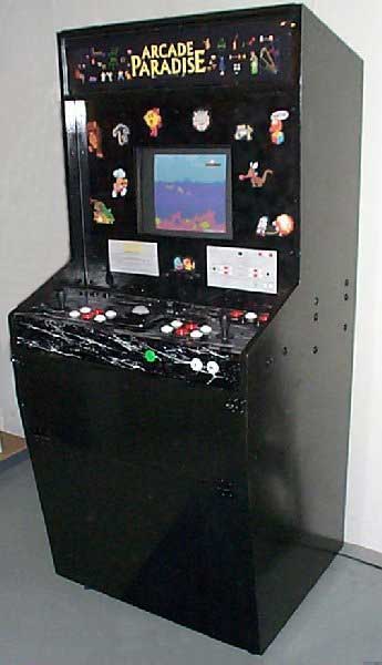 It's ARCADE PARADISE! Clue 4 U: Nobody uses 9 inch monitors in paradise. For the sake of Fuck, man. And how about those inkjet printed, glued on, arcade game mascots of old. Randomly sprinkled around the GIANT EXPANSE OF A MONITOR BEZEL they really liven up the place. The control panel seems to be contact paper of a grade even lower than marble. It's like, spilled white paint shit on black. Birdshit looking, almost. |