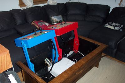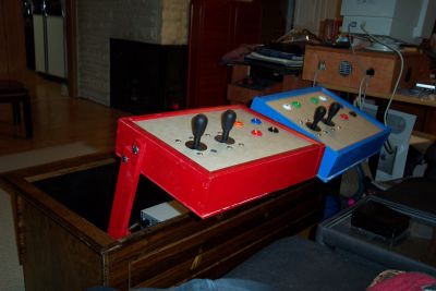 Check _this_ shit out. Dude apparently has a fixation with transformers, and a really, really red neck. He's got 2 control pods that stash inside of an (oh so lovely) coffee table. Got a computer in there for a little MAME action. Flip up the top, yank out the boxes, plant your ass on the couch and lets play some BIDEO DAMES, HOSS! You'll notice that these inbred freaks apparenly have 2 left hands, as they have 2 sticks on the left side of the box. Then, their right hands must be abnormally large. Look how far apart the buttons are. Fucking creepy. I bet these boxes don't move around or shit like that neither, look real rock solid on those little wooden supports. Go to his page, check out the reall large pictures to see the FINE CRAFTSMANSHIP. Or don't, it's probably better to leave it alone. |
